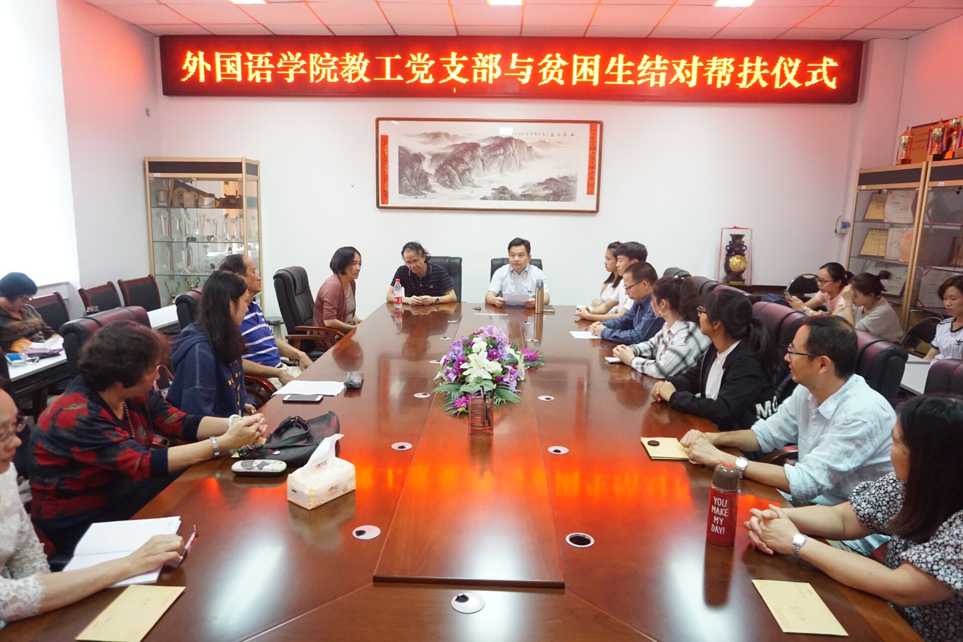 举行教工党支部与贫困生结对帮扶仪式。院党委班子、全体教工支部书记、委员和受结对帮扶的贫困生参加活动。院党委书记陈伟民主持结对帮扶仪式。